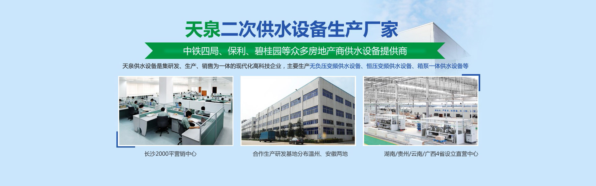長沙天泉供水設備有限公司位于長沙雨花經濟開發區。公司是集研發、生產、銷售為一體的現代化科技型企業公司生產銷售的產品有無負壓變頻供水設備、自來水加壓泵站、變頻調速恒壓供水設備、智慧標準泵房、智慧水務、一體化預制泵站、循環水系統工程等二十幾大類別。